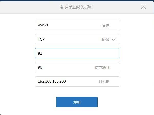 5、如果是一段端口區間的話,就選擇下方的添加規則。名稱一樣隨意填寫;協議也是一樣,根據情況,一般為TCP;起始端口就是你要開放的端口起點。結束端口就是結尾的端口。我這里填的81-90端口都是開放的。目標ip地址就是內網服務器PC的ip地址了。
