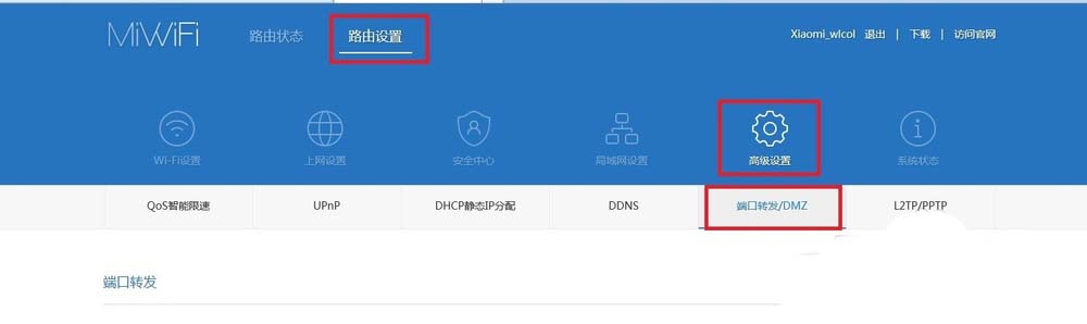 2、登錄進去路由器后,點擊“路由設置”在找到“高級設置”“端口轉發/DMZ”