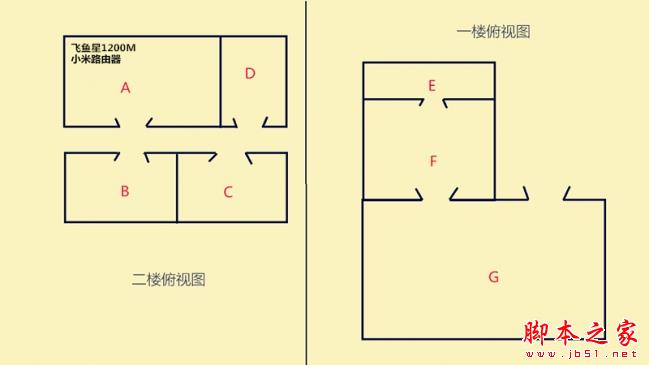父母家是200平米的復式結構住房,對于這里來說,最大的痛點就是客廳無法接收到wifi信號。由于端口是放在2樓書房的A點,所以客廳(G點)電視常年無法使用到網絡電視盒功能,我曾想過無數辦法,比如增加一個無線信號增強器,用一根很長很長的網線延伸到1樓客廳,但這樣的問題是家里會顯得很凌亂,我也曾想過多臺無線路由器的橋接問題,但信號無法保證暢通無阻。那么飛魚星VW1200能否解決我這個痛點呢?這里我使用民用級的小米路由器作為對比和參考。