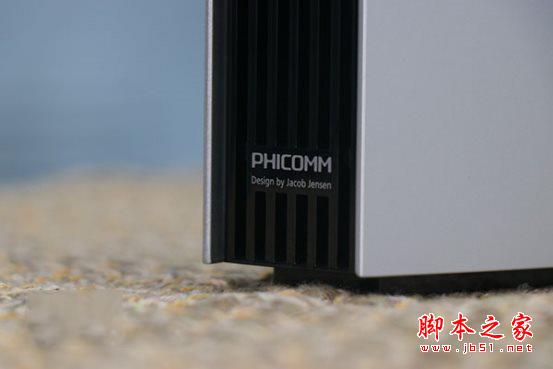 斐訊K3C的機身側面采用銀色金屬烤漆處理,正面為黑色塑料材質的散熱格柵,底部是斐訊logo,斐訊在自家Logo下方添加了Design by Jacob Jensen的標識,說明斐訊還是非常重視K3C外觀設計。