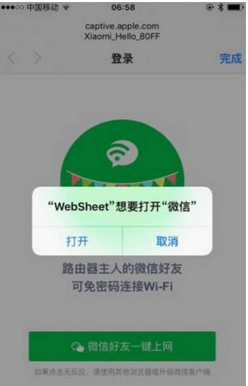 5、如果好友使用的是 iPhone,過程和 Android 幾乎一樣,唯一的不同是點擊“微信好友一鍵上網(wǎng)”按鈕后,iPhone 會彈出打開“微信”的提示窗(Android 會不提示直接打開)。