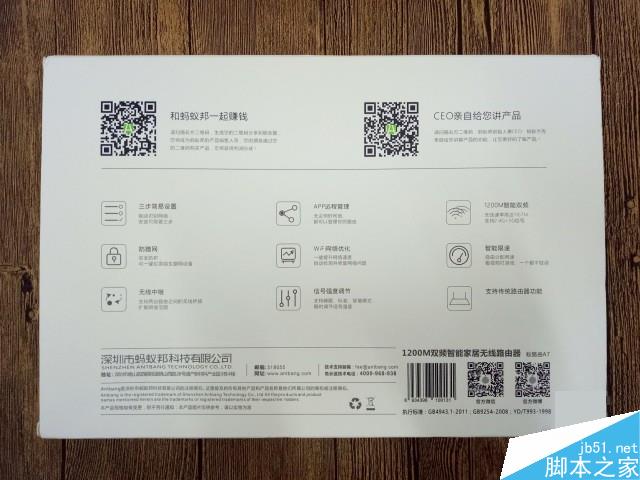 在包裝盒背面我們首先看到的是分享朋友圈的利潤分成二維碼以及蟻路由A7產(chǎn)品功能介紹二維碼。在背面的中間位置用了很大的篇幅向我們介紹了這款路由器產(chǎn)品的特點,主要包括設(shè)置簡單、遠(yuǎn)程管理、雙頻、防蹭網(wǎng)、無線中繼、信號調(diào)節(jié)等。背面的底部則與其它產(chǎn)品一樣,印有制造商信息、執(zhí)行標(biāo)準(zhǔn)、官方微博和微信二維碼以及條形碼信息。