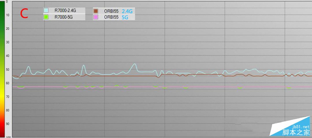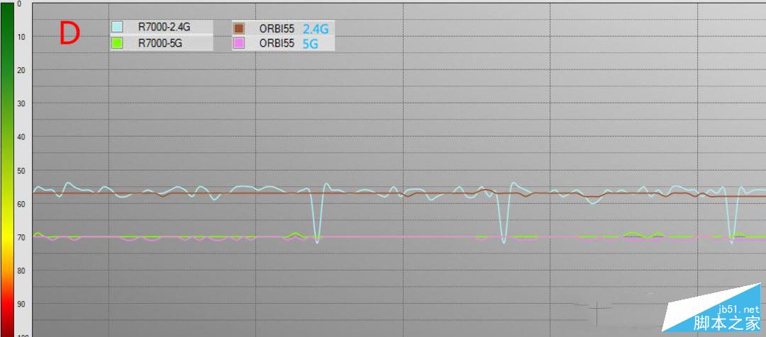 C點orbi的2.4G比R7000好些,5G則反之,D點兩者差不多。