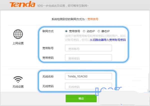 (1)、當檢測聯網方式是:寬帶撥號 ——>需要在頁面中填寫:“寬帶帳號”和“寬帶密碼”——>然后接著設置:無線名稱、無線密碼——>最好點擊“確定”。