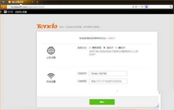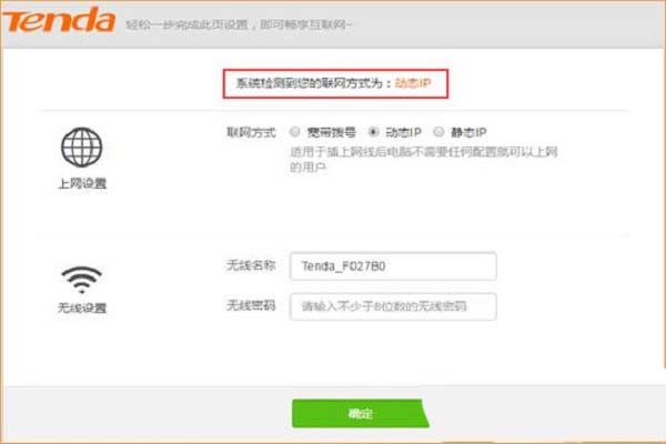 (2)、當檢測到聯網方式是:動態IP ——>直接在頁面中設置:無線名稱、無線密碼——>然后點擊“確定”按鈕就可以了。