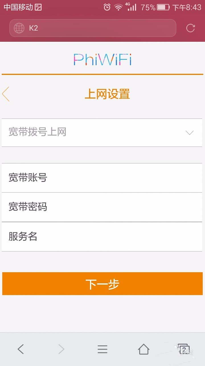 3、初次設置網絡時,打開手機瀏覽器會自動跳出設置頁面。也可查看路由器背面顯示登陸地址為p.to,在手機瀏覽器中輸入。連上wifi后會發現IP地址是192.168.2.1,也可以輸這個地址連接。