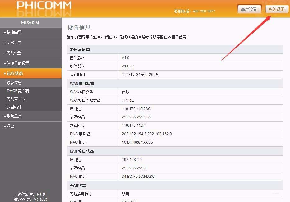 3、在路由器的主界面,我們點擊其右上角的“高級設置”快捷鏈接