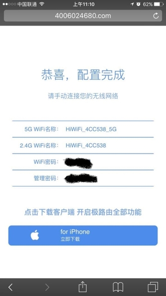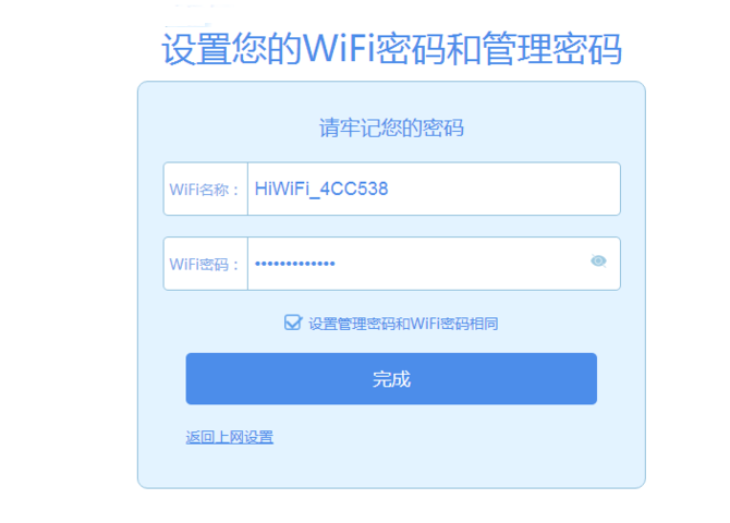 6、建議勾選“設置管理密碼和WiFi密碼相同”,最后生成極路由配置完成界面。