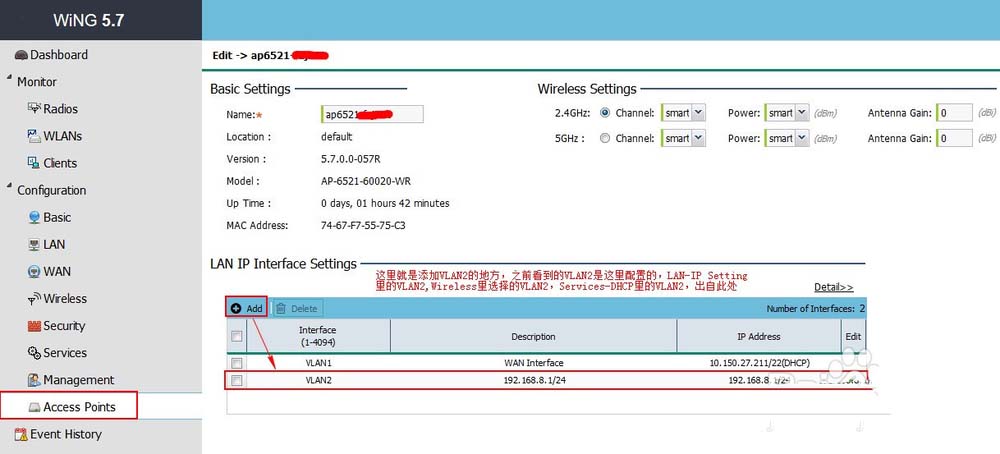 8、Access Points配置,點擊你設置的無線名稱,可以進到設置界面,要設置什么VLAN或IP都在這里。