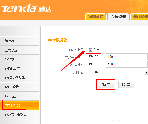 5、點擊“DHCP服務”項,確保已勾選“啟用 DHCP服務器”項。設置這一步可實現利用DHCP服務器自動為接入的設備分配IP地址。