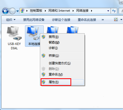 2、接下來右擊“本地連接”,從彈出的菜單中選擇“屬性”。