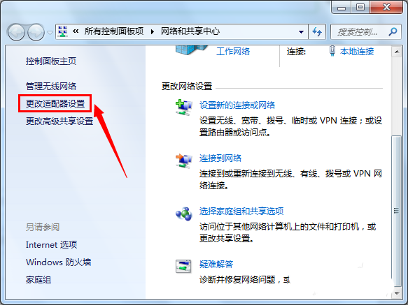 1、打開“控制面板”,點擊“網絡和共享中心”按鈕,在彈出的窗口中點擊“更改適配器設置”按鈕。
