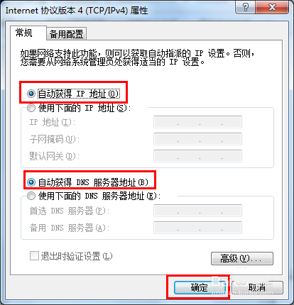 4、然后在彈出的IP設置窗口中,勾選 “自動獲取IP地址”和“自動獲取DNS服務器地址”項,點擊“確定”完成設置。至此,電腦就可以正常上網啦,路由器快速設置也就完成啦。