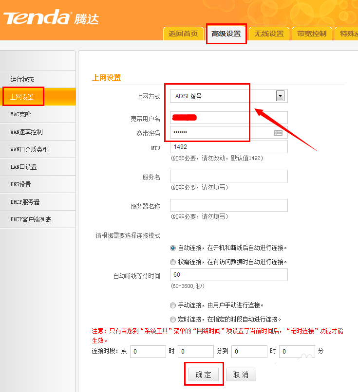 4、登陸路由器后臺管理界面完成后,切換至“高級設置”選項卡,點擊“上網設置”,然后選擇“上網方式”,同時設置“寬帶用戶名”和“寬帶密碼”,點擊“確定”按鈕。