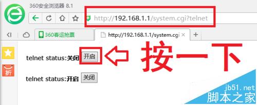 2、在地址欄輸入“http://192.168.1.1/system.cgi?telnet”,打開Telnet功能(已打開請跳過)。