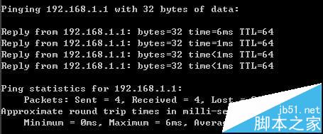 5、測試令檢查您的計算機和路由器之間是否連通。點擊“開始”——“運行”——“輸入CMD”點擊確定。在打開的CMD窗口中輸入ping 192.168.1.1 其結果顯示如下。說明已近與路由器連通了。
