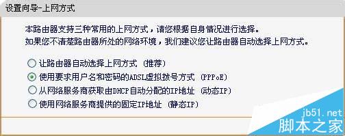 1、單擊下一步,進入上網方式選擇畫面。這里我們演示一般家庭用戶所采用的PPPOE撥號上網的方式。具體根據您的實際情況。