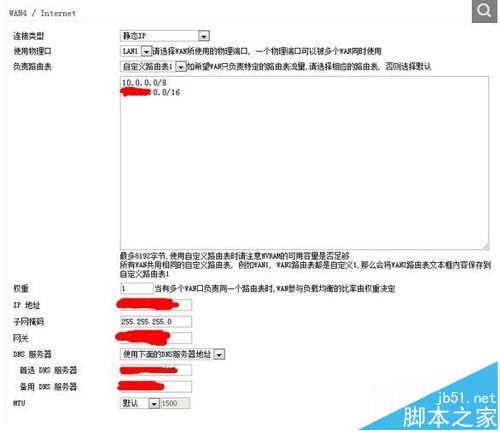6、對于內網來說一般分為DHCP獲得內網路由或者靜態內網IP地址。這都很簡單,關鍵是要設置好自定義路由表,由于我的內網是10.x.x.x的,所以我這里設置的是10.0.0.0/8后面表示的是子網掩碼。同樣常見的有:192.168.0.0/16,另外關于一條寬帶線路多播疊加帶寬的情況,如何判斷是否可以多播疊加帶寬: