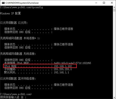 2、在打開命令操作窗口后,再鍵入 ipconfig 命名,完成后,按回車鍵(Enter)運行,之后就可以查看到本地IP地址了,如圖所示。