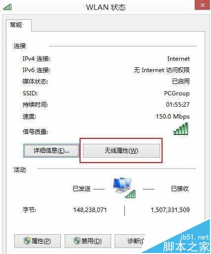 4、從打開的“WLAN狀態(tài)”窗口中,點(diǎn)擊“無線屬性”按鈕,即可進(jìn)入“無線連接 屬性”界面。