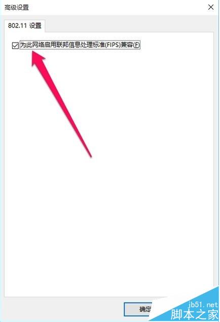 6、在”高級(jí)屬性“窗口中,勾選“為此網(wǎng)絡(luò)啟用聯(lián)邦信息處理標(biāo)準(zhǔn)(FIPS)兼容”項(xiàng),點(diǎn)擊“確定”完成設(shè)置 。
