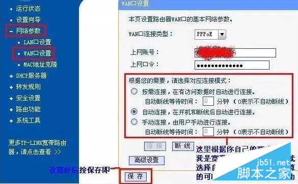 選擇無線設置中的無線安全,安全模式選擇WPA2-PSK模式。WPA加密規則選擇AES。設置無線網絡密碼,建議設置自己熟悉易記的密碼,此外不要過于簡單,防止被人蹭網。設置完成后,保存設置。