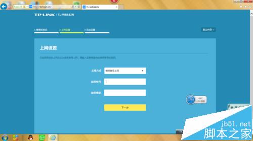 6、選擇聯(lián)網(wǎng)方式(我的是寬帶連接,其他可能略有不同)填寫寬帶用戶名(如果忘記了,請(qǐng)重啟電腦,點(diǎn)擊寬帶連接其中就有)然后填寫用戶名對(duì)應(yīng)的密碼(這一步輸入對(duì)錯(cuò)真正決定路由器是否能使用)