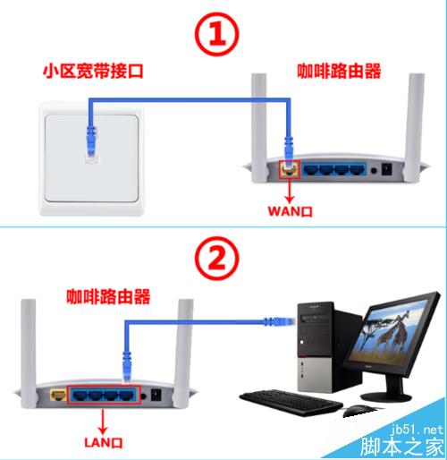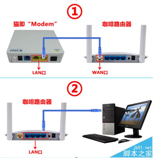 a、用網線將咖啡路由器的WAN口和Modem的LAN口連接起來,如圖1所示;