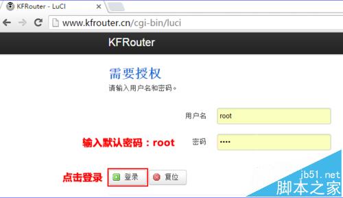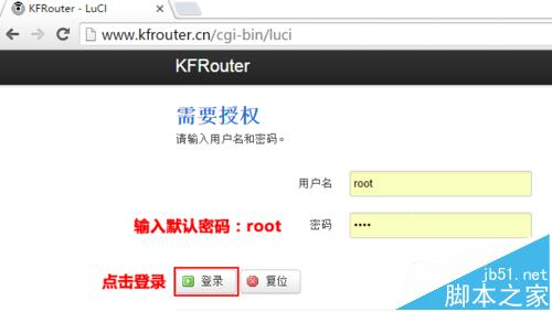 打開瀏覽器,在地址欄輸入www.kfrouter.cn或192.168.133.1按回車鍵進入登錄后臺,輸入默認密碼:root,點擊登錄