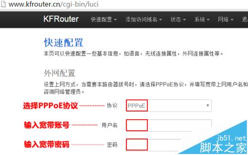 在快速配置頁面找到外網配置,選擇PPPoE協議,輸入寬帶賬號和密碼