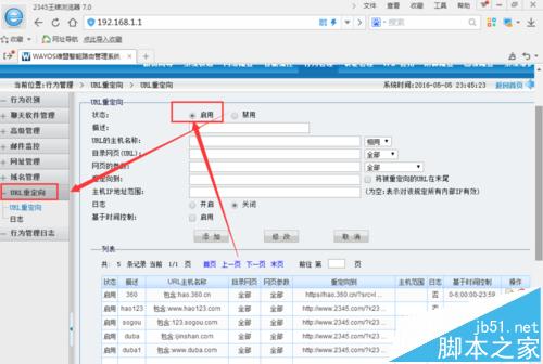 3、在左側菜單中,找到 URL重定向,并點擊展開下級菜單。URL重定向,就是域名重定向。在左邊窗口, URL重定向的狀態設為“啟用”,這樣才生效。下圖我已經做好了幾個URL重定向。現在我們再來新建一個域名重定向。