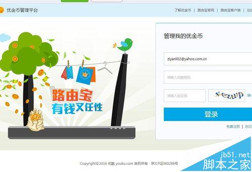 5、至此,我們已設(shè)置成功優(yōu)酷路由寶賺取優(yōu)金幣的模式為“固定收益模式”了。如果想了解每天優(yōu)金幣的賺取情況,那么點(diǎn)擊上圖中的“進(jìn)入優(yōu)金幣管理平臺(tái)”大藍(lán)色按鈕。點(diǎn)擊之后,彈出“優(yōu)金幣管理平臺(tái)”登錄窗口,如下圖