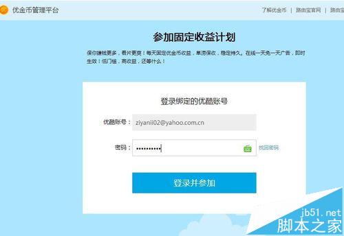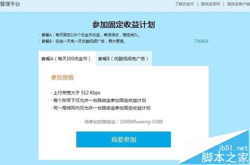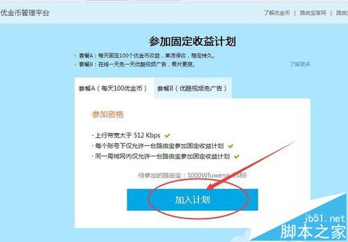 3、優(yōu)酷路由寶會(huì)自動(dòng)檢測(cè)你是否達(dá)到了參加固定收益計(jì)劃的最低條件,如果都符合條件,那么點(diǎn)擊下方的“加入計(jì)劃”命令按鈕吧,如下圖所示