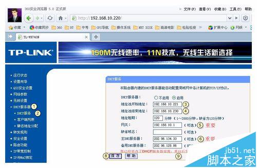 3、很重要:點(diǎn)擊「DHCP服務(wù)器」->「DHC服務(wù)器設(shè)置」 把「地址池起始地址」設(shè)置為192.168.0.200把「地址池結(jié)束地址」設(shè)置為192.168.0.220,網(wǎng)關(guān)設(shè)為:192.168.0.1,填寫上級路由器的首選DNS服務(wù)器和備用DNS服務(wù)器,保存。這里不填寫DNS服務(wù)器的話無法上網(wǎng)的!我試驗過幾次都是這樣!