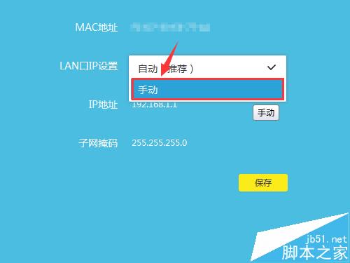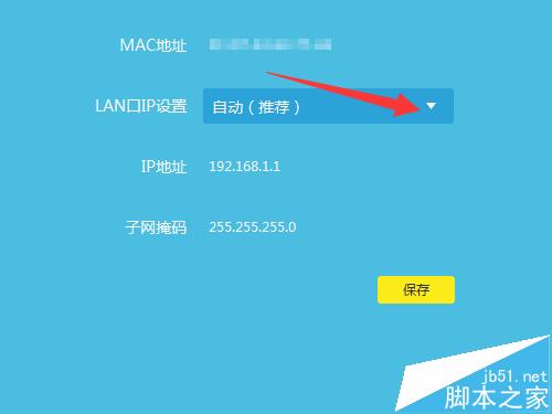4、路由器管理IP地址默認為自動設置,在沒有沖突的情況下為默認的192.168.1.1,更改IP地址點擊右邊的下拉菜單