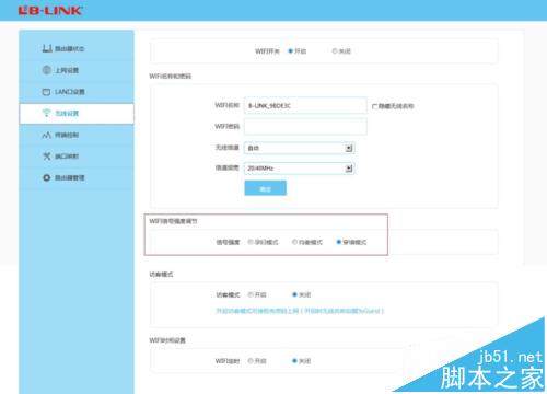 3、必聯BL-AC886M路由器無線設置部分,在這里你可以修改你的無線wifi密碼,可以根據你的需求選擇wifi信號強度調節,我選擇的是穿墻模式。還能設置wifi定時開關與訪客模式。