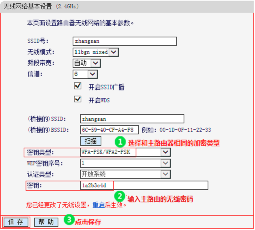 4、輸入主路由器無線密碼“密鑰類型”選擇與主路由器的一致——>“密鑰”選項中,填寫主路由器的無線密碼——>點擊“保存”。