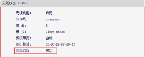 步驟四、檢查橋接設置是否成功在水星MW3030R的設置界面,點擊“運行狀態”——>找到“無線狀態 2.4GHz”——>觀察“WDS狀態”,如果顯示:成功,說明MW3030R路由器無線橋接設置成功。