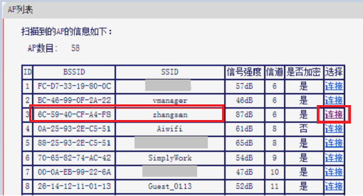 3、選擇主路由器信號在掃描結果中,找到主路由器的無線信號(本例是:zhangsan),然后點擊后面的“連接”。