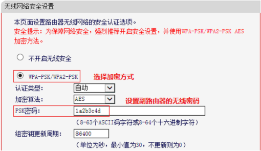 5、設置副路由器無線密碼點擊“無線設置2.4GHz”——>“無線安全設置”——>選中“WPA-PSK/WPA2-PSK AES”——>“PSK密碼”處填寫和主路由器相同的無線密碼——>點擊頁面下方的“保存”并重啟路由器。