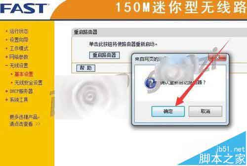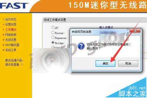 3、此時(shí)會(huì)彈出,路由器要求重啟以切換無(wú)線工作模式的請(qǐng)求,點(diǎn)擊 確定,等待重啟完成.
