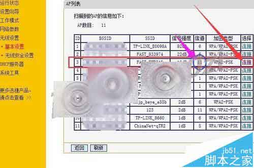 5、在出現(xiàn)掃描到AP的信息列表中,找到我們可以連接的信號(hào),并記下信道,這個(gè)非常重要,然后點(diǎn)擊 連接.