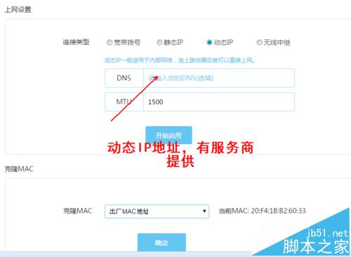 3、首先將動態IP上網方式,這需要輸入寬帶服務商提供的DNS和MTU,輸入后點擊開始使用即可;