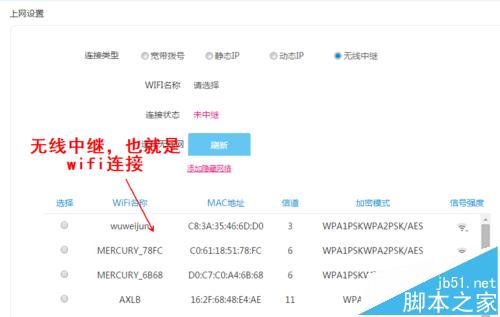 6、現在比較常用的就是無線中繼,也就是利用別人的WIFI進行轉接,和手機WiFi使用方法一樣,找到網絡,輸入密碼即可中繼;
