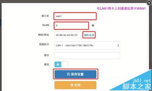 2、添加規(guī)則,在lan1接口上創(chuàng)建wan1,VLAN填0(表示基于MAC的VLAN),MAC地址隨機(jī)生成