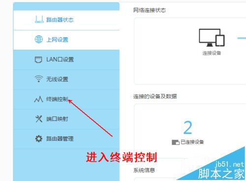 3、點(diǎn)擊路由管控的左邊菜單中的終端控制按鈕,進(jìn)行終端控制設(shè)置;