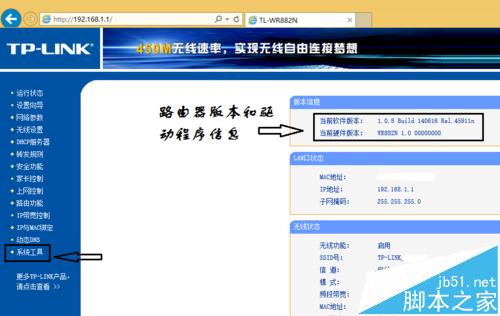 3、進入到TP-LINK無線路由器管理頁面,第一步選擇系統工具選項,路由器的版本和驅動程序信息在圖片上也有標出。