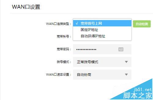 3、進入路由器的“WAN 口設置”后,選擇右側屏幕的“WAN口連接類型”里的“寬帶撥號上網”(看下圖),WAN口連接類型就是網絡運營商給我們提供的上網方式,寬帶撥號上網就是使用我們的網絡運營商給我們提供的寬帶帳號、密碼進行上網的方式