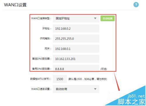 5、已知IP地址,設置固定IP地址。回到本文的第二步,選擇“WAN口連接類型”里的“固定IP地址”(看下圖1),按要求填寫IP地址、子網掩碼、默認網關及DNS服務器(看下圖2),靜態IP地址可由運營商提供,但是缺點是容易IP相互沖突,引起設備掉線