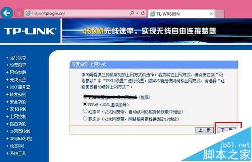 8、然后會出現一個設置向導,我們下一步會出現選著上網模式,我們是寬帶上網,就選著PPPOE上網模式,下一步。